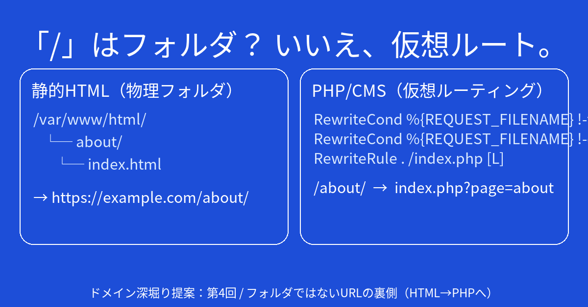 | 項目 | 静的HTML(物理フォルダ) | PHP/WordPress(仮想ルーティング) |