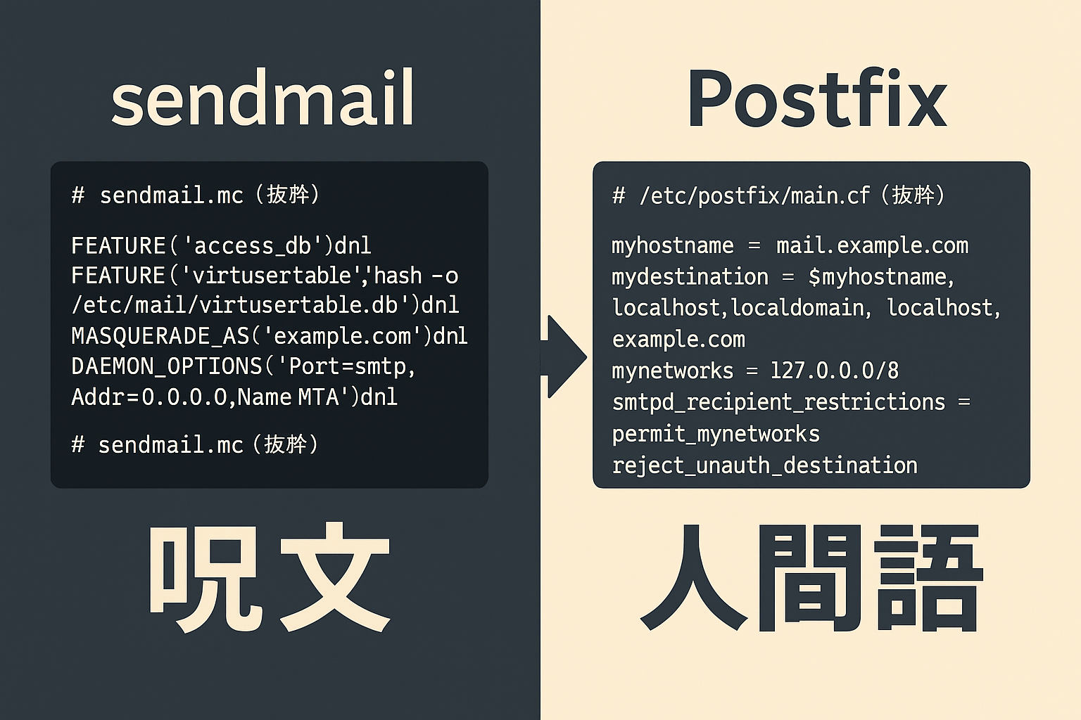 - sendmail は“巨大単一コア”で柔軟だが、運用の複雑さが致命的。
