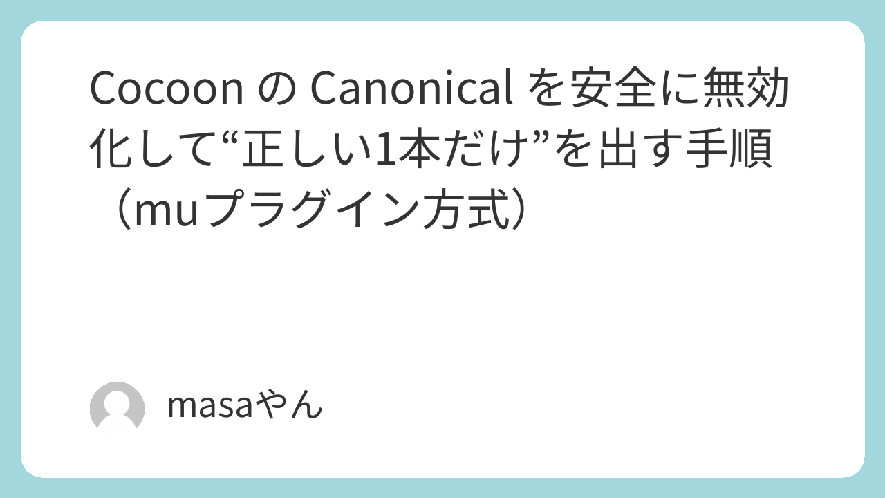 - MU プラグインで Cocoon の canonical を止め、自前の安全版 canonical を 1 本だけ出せば安定します(テーマ更新にも強い・可逆)。
