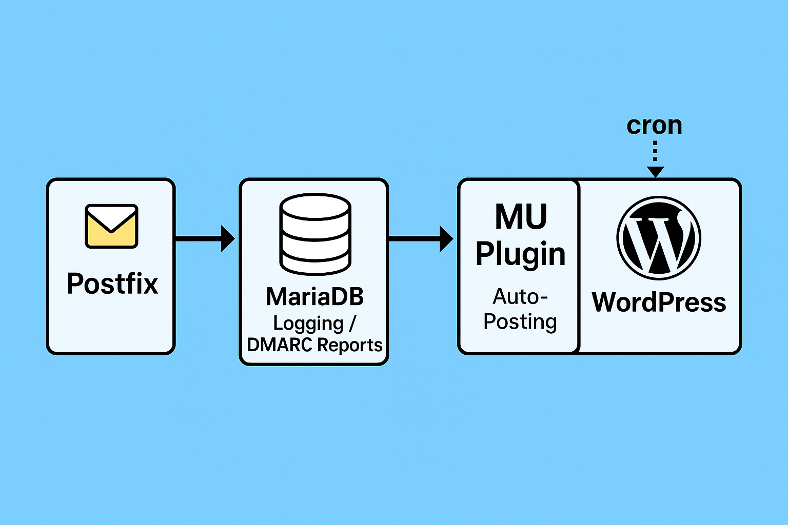 Postfix ─▶ MariaDB(拒否・DMARC集計) │ ▼ MUプラグイン ─▶ WordPress投稿(カテゴリ/タグ/アイキャッチ付) ▲ │ cron(週次)
