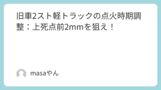 つぶやき 旧車2スト軽トラックの点火時期調整:上死点前2mmを狙え! 1970年代のスズキ・キャリイやダイハツ・ハイゼットなど、2サイクル360ccクラスの軽トラックでは、 プラグが溶ける・始動性が悪いといったトラブルの原因が「点火時期のズレ」にあることがよくあります。 本記事では、上死点前2.0mmを基準に... 2025.09.21 つぶやき