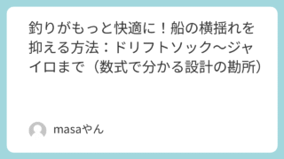 つぶやき 釣りがもっと快適に!船の横揺れを抑える方法:ドリフトソック~ジャイロまで(数式で分かる設計の勘所) 釣りでつらい横揺れ対策を総まとめ。ドリフトソック、フロッパーストッパー、ジャイロの違いと、効果を見積もる計算式を解説。釣りで一番つらい「横揺れ」問題と基本解釣りは止まる時間が長いので、横波を受けてロール(横揺れ)がきつくなりがちです。まずは... 2025.09.28 つぶやき